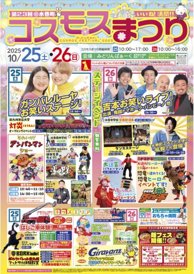 毎年開催される「水巻町コスモスまつり」では、さまざまなイベントも楽しめます。こんな有名芸能人が来て観覧無料ってすごい。JR水巻駅からシャトルバスも運行されます。