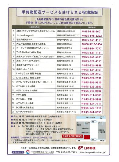 以下のホテルに宿泊すると長崎駅で朝に預けた荷物が18時までにホテルに届くサービスが受けられます(有料)。