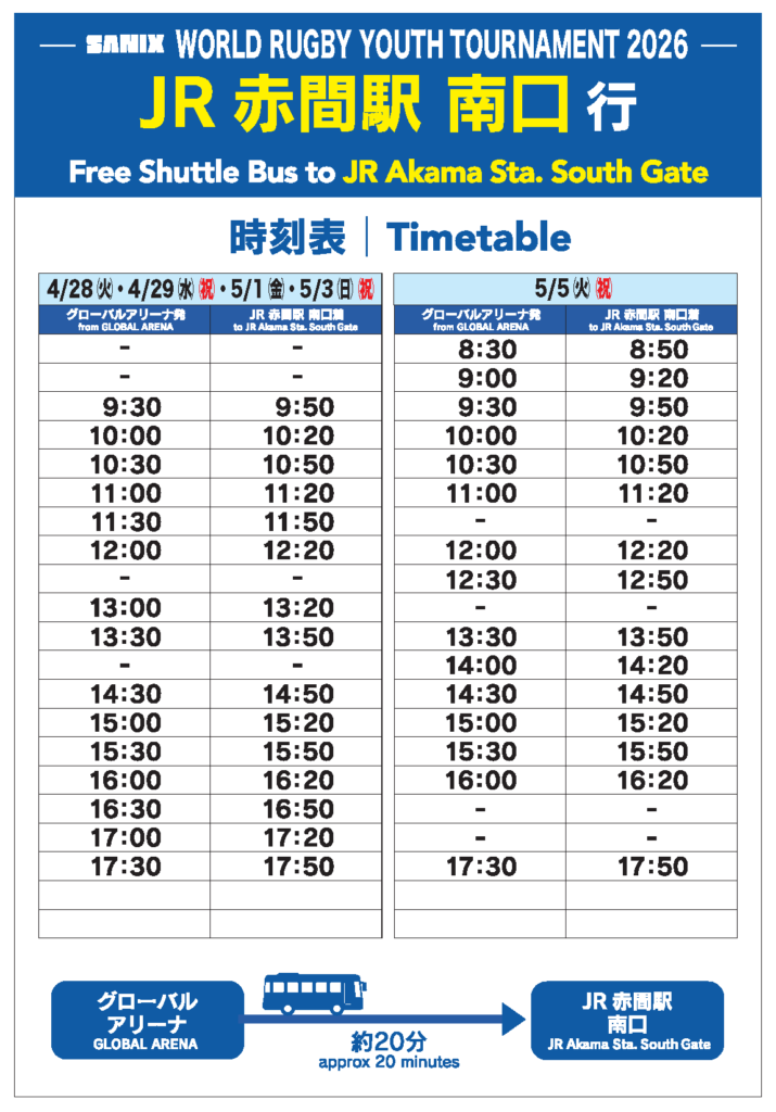 試合のある日:4月28,29日 5月1,3,5日はJR赤間駅から無料シャトルバス運行